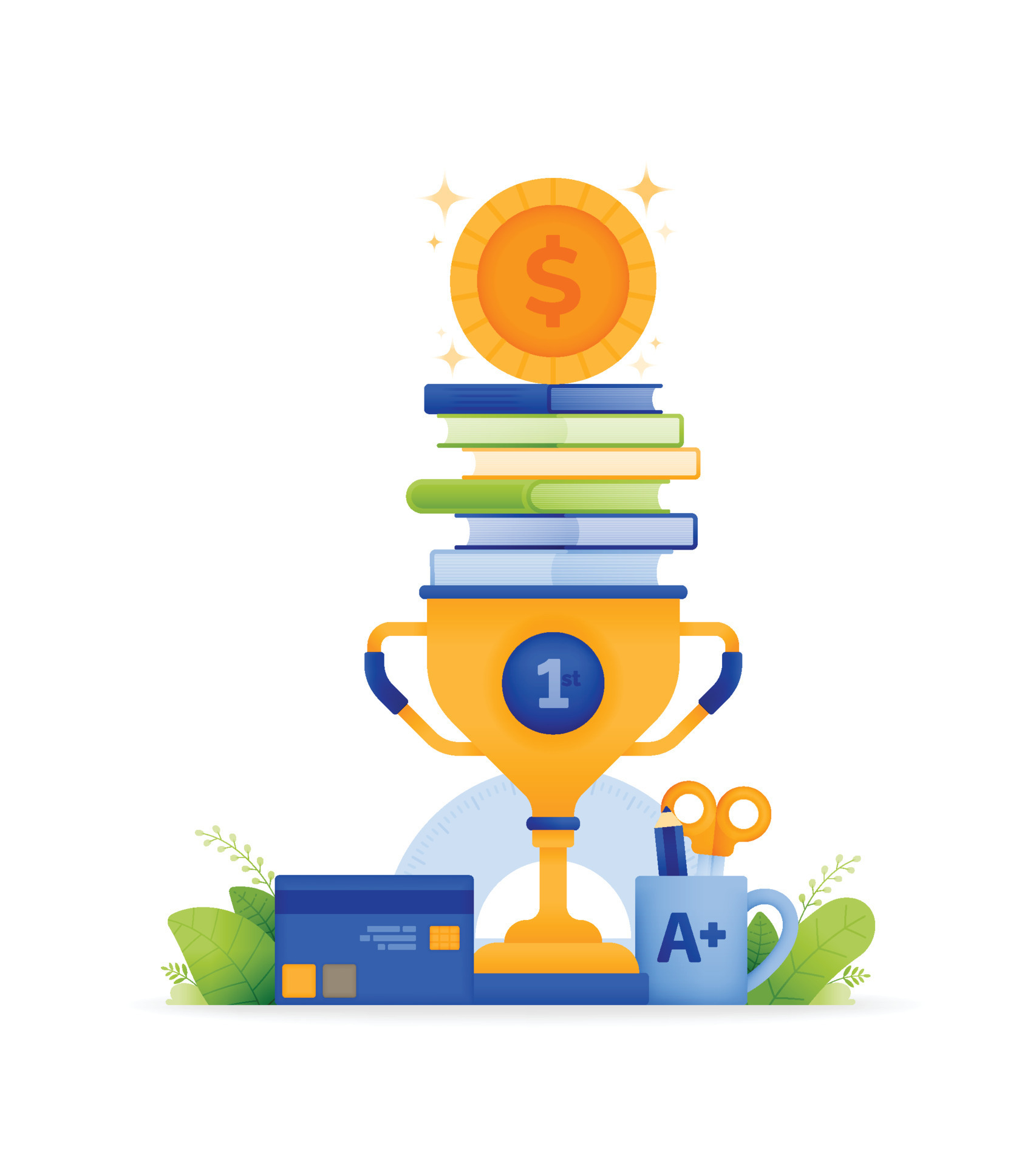 illustration of educational scholarship program. trophy with pile of