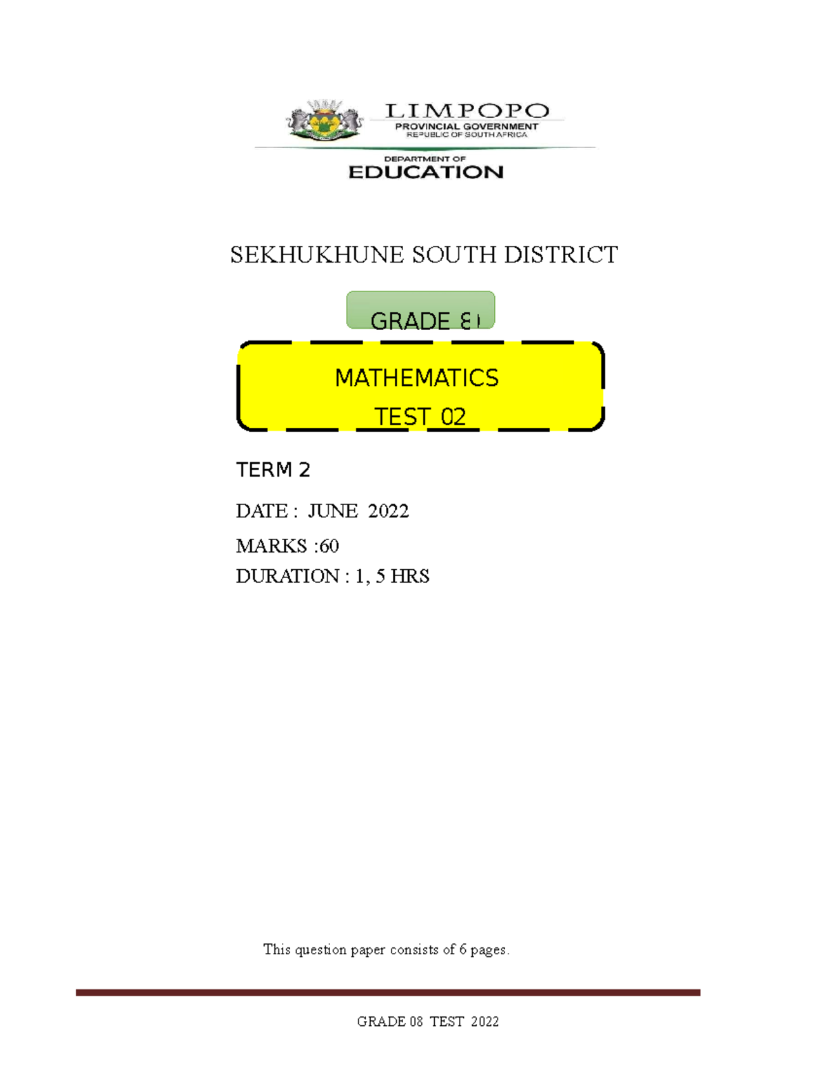 Grade 8 Maths TEST 2 - practice test - SEKHUKHUNE SOUTH DISTRICT DATE