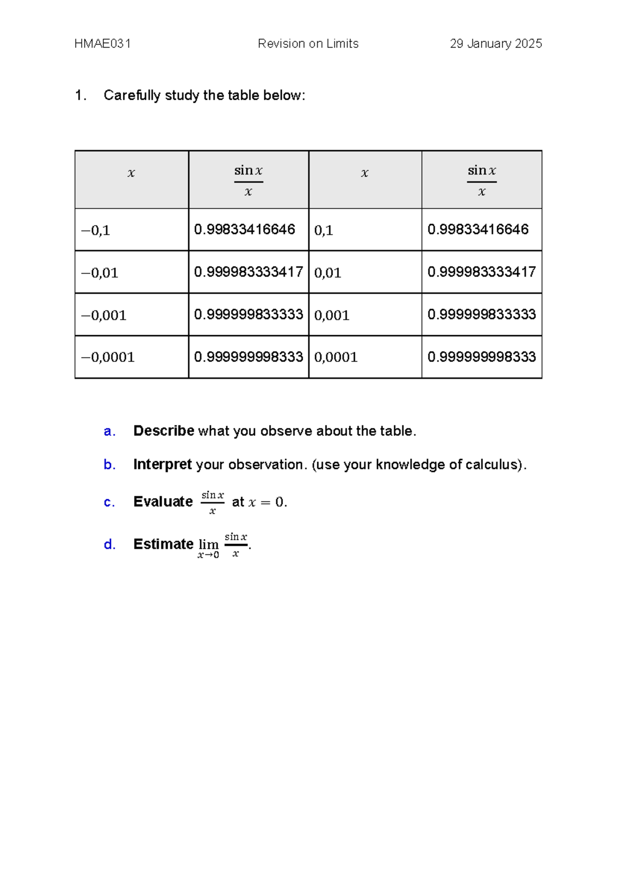 Classwork- Revision On Limits (29 Jan 2025) - Carefully study the table