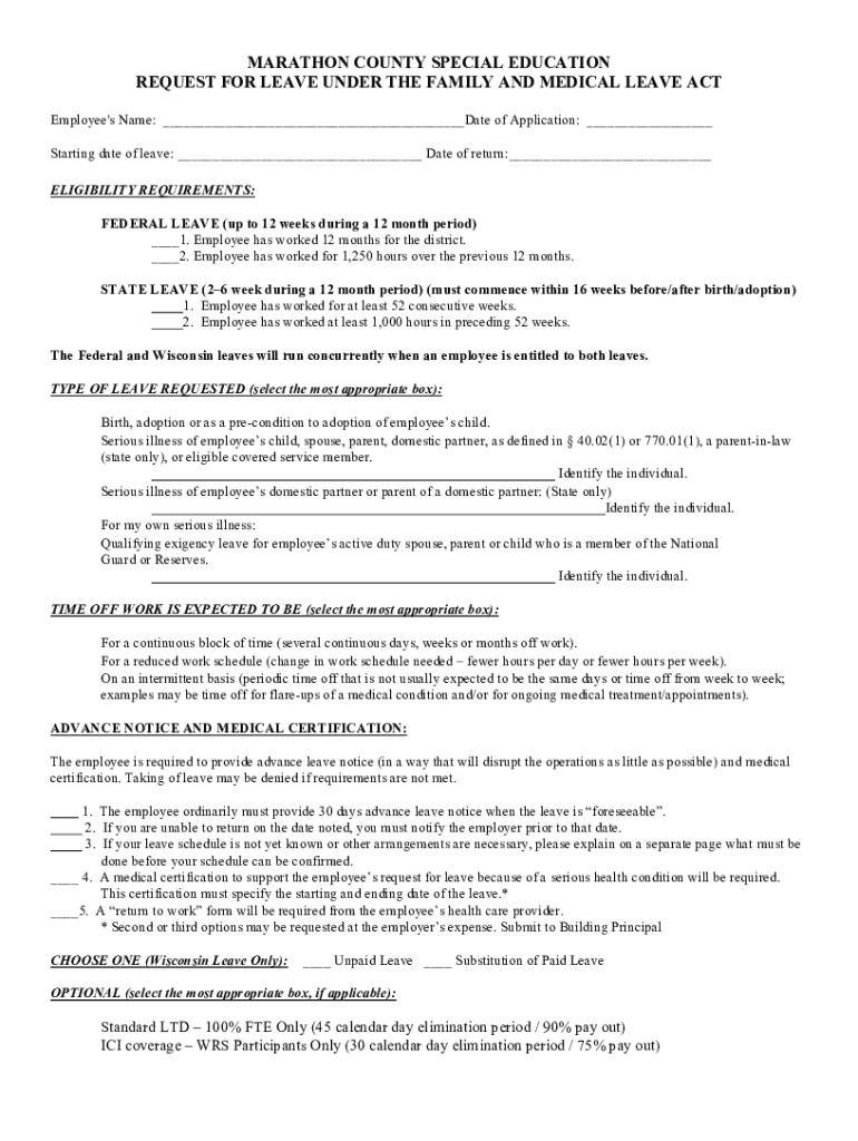 Fillable Online MARATHON COUNTY SPECIAL EDUCATION REQUEST FOR LEAVE