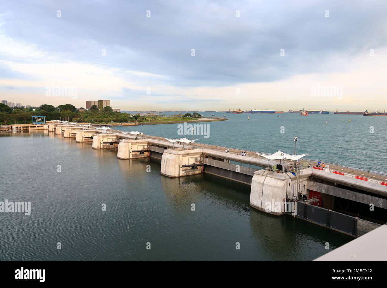 Aerial view of Marina Barrage, a large dam built at the confluence of
