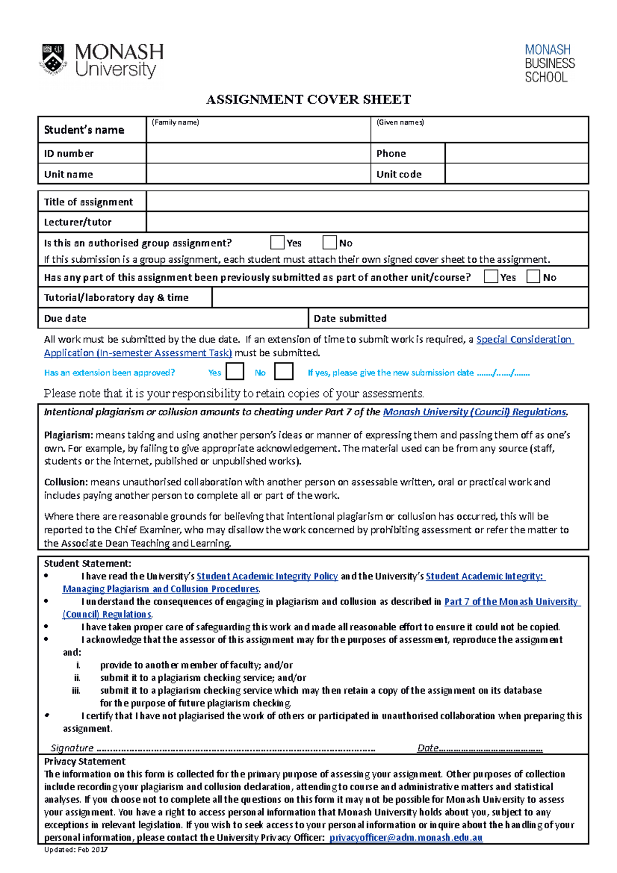 Monash business school assignment cover sheet - ASSIGNMENT COVER SHEET